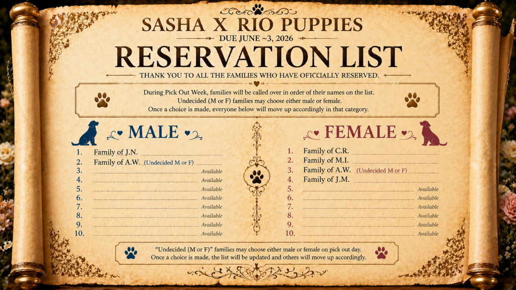 If you are inquiring while our puppy reservation list is open, you’ll be eligible to apply for your name to be added to the limited list! If you just missed it, no worry, as the process still can include you during the next chosen season. Also, there’s a good possibility that Sasha and Scarlet end up with larger than expected litters. In that case, we will contact you (even though you may not have made the initial reservation list) to ascertain whether or not you’re still interested. So, please fill out the puppy inquiry even though the reservation list might be closed.